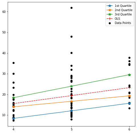 이번에는 탑승하는 승객 수에 따른 가격의 변화를 보고 싶었다. 승객 수는 4~6명으로 제한했다. 왜냐하면 나머지 승객 수에 대한 데이터가 10개도 안되었기 때문이다. 여기서는 4분위수에 대한 회귀 계수를 추정해보고자 한다. 여기서는 최소 제곱법을 이용한 회귀 모형도 추가해보았다.