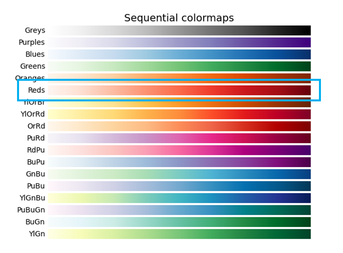 박스를 클릭하셔서 해당 사이트로 들어가면 여러가지 사전에 정의된 컬러맵을 볼 수 있는데요. 꽁냥이는 그중에서 Reds를 사용하려고 해요.
