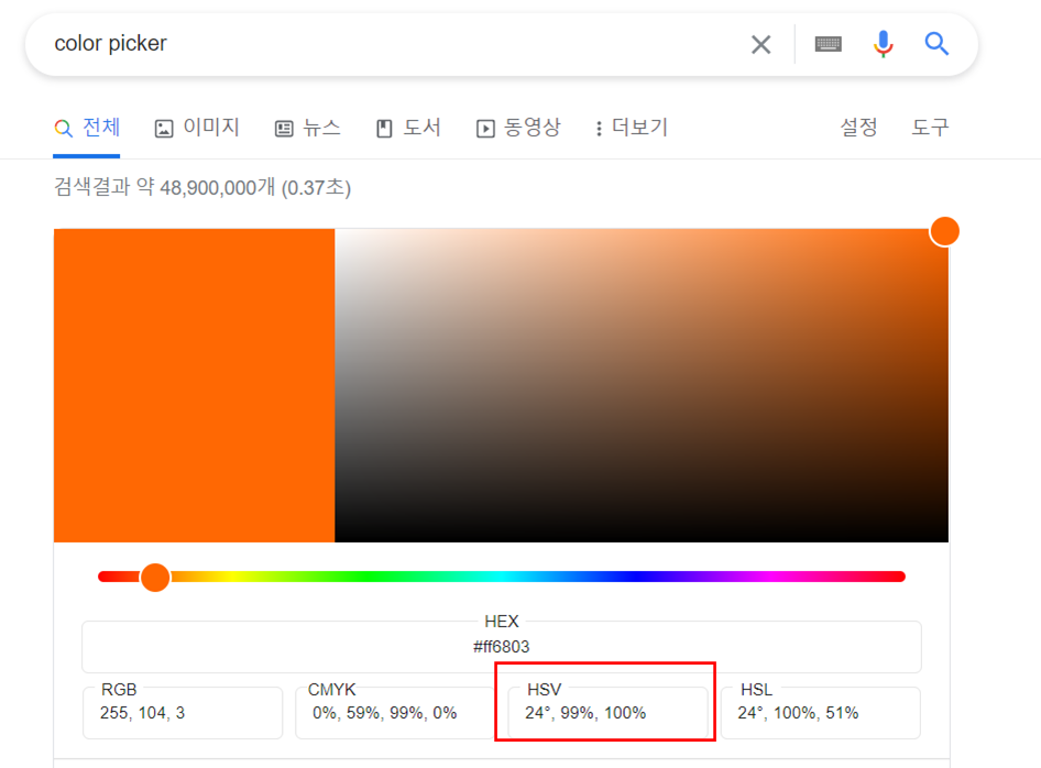 먼저 구글에 'color picker'를 검색하면 색상을 선택할 수 있는 곳이 나와요. 여기에서 자기가 원하는 색상을 찍어주면 아래에 RGB, HSV 등 여러 가지 값이 자동으로 생성됩니다. 이때 HSV 값을 잘 기억해주세요. 저는 주황색을 선택했고 이에 해당하는 HSV 값이 각각 24도, 99%, 100%입니다.