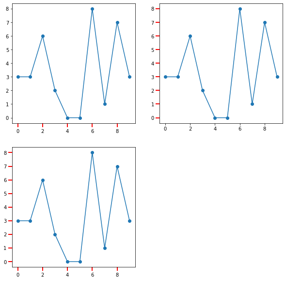 지금까지는 눈금을 설정했을 때 x, y축 모두 적용했는데요. 특정 축에만 설정할 수 있습니다. tick_params에 axis인자를 이용하면 됩니다. 아래 코드는 눈금의 길이를 8, 색상은 빨간색으로 설정하며 이를 x축, y축 그리고 두 개 축 모두에 적용하도록 하는 코드입니다.