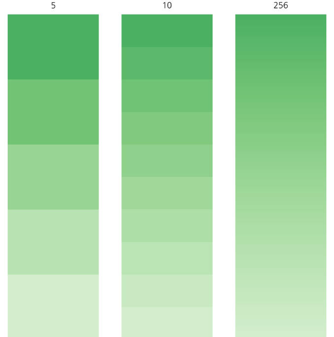 위에서 256이라는 숫자를 주목해주세요. 이 값은 그라데이션의 연속성을 결정하는 값이에요. 이 값이 커야 연속적인 색상의 변화를 표현할 수 있어요. 이해가 안 되신다고요? 꽁냥이가 여러분의 이해를 돕기 위해서 앞의 숫자에 따른 그라데이션의 변화를 간단하게 구현해봤습니다. 아래 코드를 실행해보세요(코드 설명은 주석을 참고하세요).