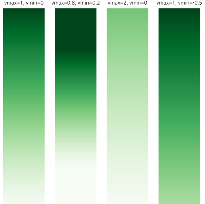두 번째를 보시면 vmin값이 0.2인데 막대기 아래쪽(가장 밝은 색)이 전체길이의 20%로 만큼 차지하고 vmax값은 0.8인데 1-0.8=0.2이므로 막대기 위쪽(가장 진한 색)이 전체 길이의 20%로 만큼 차지하는 거에요.