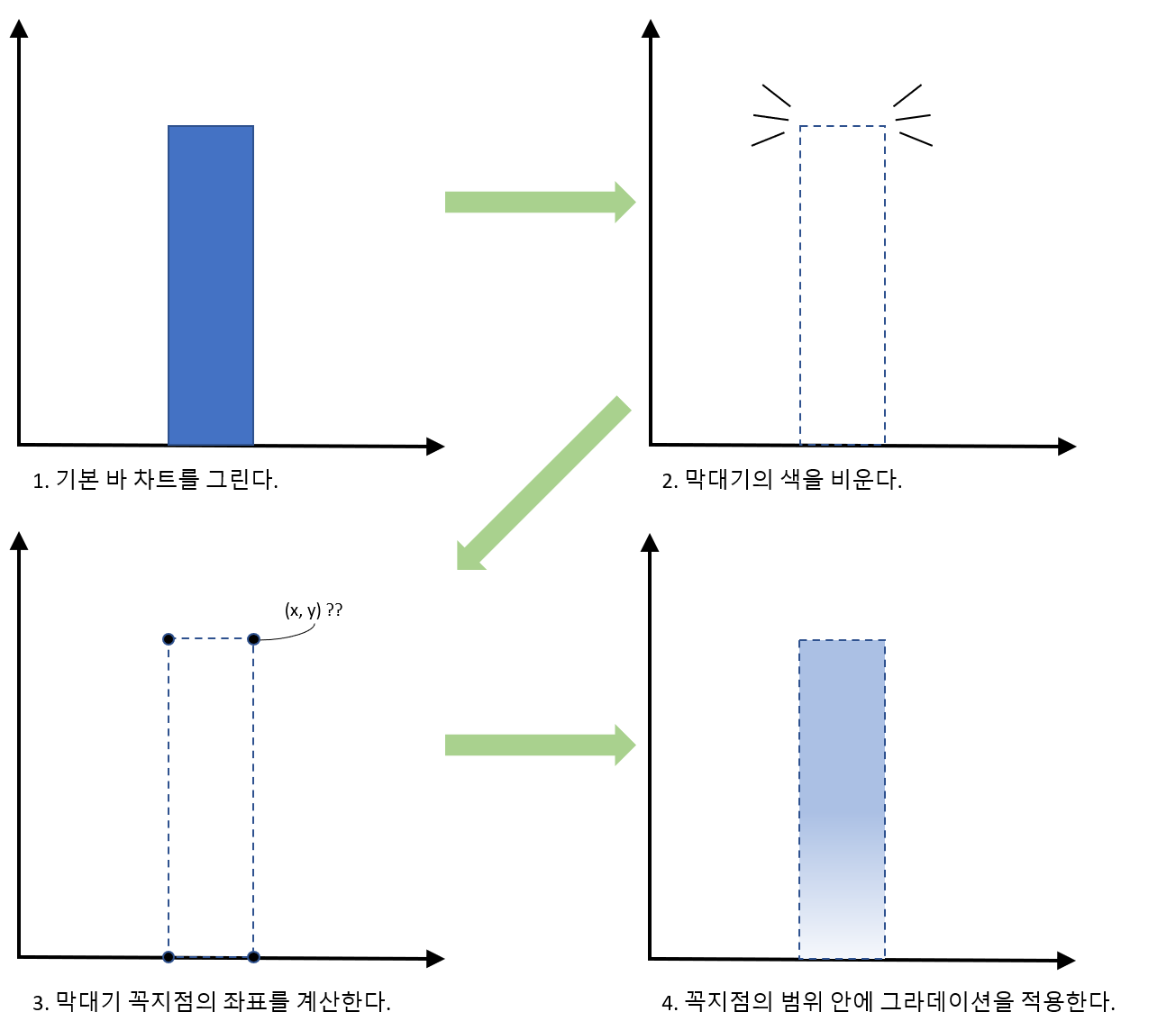 위 그림은 그라데이션을 적용하는 과정을 설명한 그림인데요. 먼저 1) 막대기를 생성하고요. 그런 다음에 2) 막대기의 색을 비워주고 3) 막대기의 꼭지점 좌표를 계산하여 그라데이션을 적용할 범위를 정해줍니다. 마지막으로 4) 범위안에 그라데이션을 덧칠해주면 됩니다~