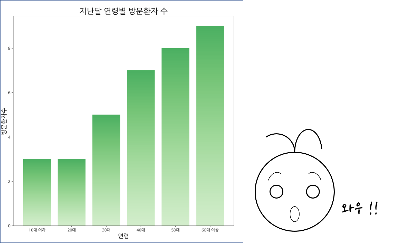 자! 방법은 알았으니 코드로 구현해볼까요? 바 차트로 그릴 데이터는 이전 포스팅과 동일하게 연령별 방문 환자수로 정했습니다.