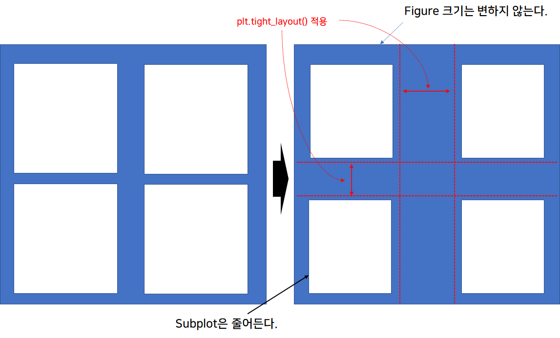 Matplotlib에서는 tight_layout을 이용하여 subplot들이 겹치지 않도록 최소한의 여백을 만들어주는 역할을 합니다. tight_layout의 작동방식은 다음 그림과 같이 전체 figure의 크기는 변화시키지 않은 채 중앙에서 가로방향 세로 방향으로 여백을 만들어 나가며 그에 따라 subplot이 적정 비율로 줄어들게 됩니다.