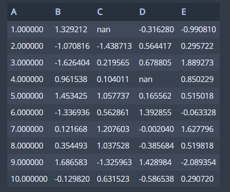df = pd.concat([df, pd.DataFrame(np.random.randn(10, 4), columns=list('BCDE'))],