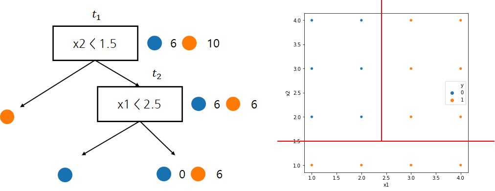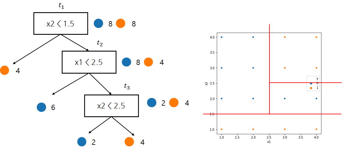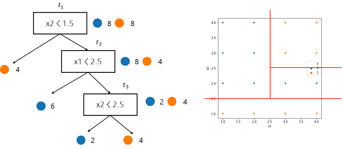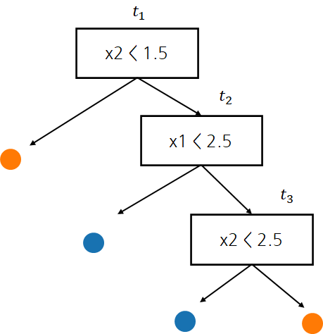 먼저 $t_3$이 분리되었을 경우 오분류 개수(오분류 개수 말고 다른 불순도를 측도로 사용할 수 있다)는 2개이다. 왜냐하면 $x_2 \geq 1.5, x_1 \geq 2.5$ 영역에서 남아있는 라벨은 모두 주황색인데 이중 2개를 파란색으로 분류하기 때문이다. 또한 분리되기 전 오분류 개수는 0이다. 왜냐하면 $x_2 \geq 1.5, x_1 \geq 2.5$ 영역에서 모두 주황색으로 분류하기 때문이다.