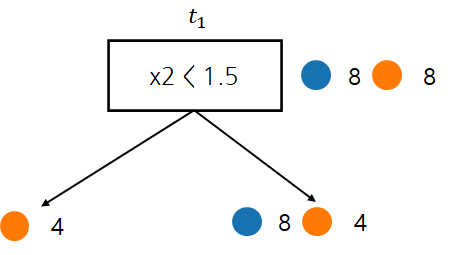 먼저 노드 $t_1$에 해당하는 데이터는 16개이며 이에 대한 오분류율은 8/16인 것을 알 수 있다. 따라서