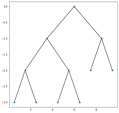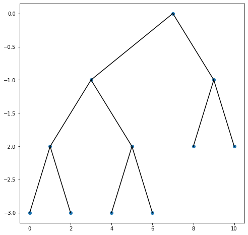 먼저 이 나무를 노드의 층과 Traverse In Order를 이용하여 x, y 좌표를 부여해보았습니다. 아래 코드는 부여한 x, y좌표를 이용하여 scattor plot을 그려본 것입니다. 이때 draw_connect_line 함수는 노드와 노드를 연결하는 선을 그려주는 함수입니다.