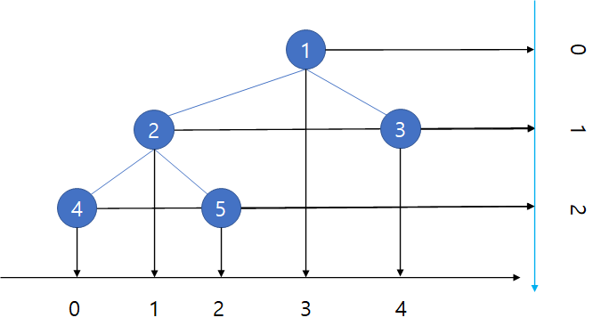 이진 트리를 예쁘게 그리기 위해서 원칙을 갖고 그리게 됩니다. 여기서는 그 원칙에 대하여 몇 가지 소개하려고 합니다. 먼저 노드가 속한 층(Level)이라는 개념을 먼저 소개하겠습니다. 여기서 노드가 속한 층이라는 것은 그 노드의 부모 노드의 개수 + 1로 정의하겠습니다. 예를 들어 아래 그림에서 2, 3번 노드, 4, 5번 노드는 같은 층에 속해있습니다.