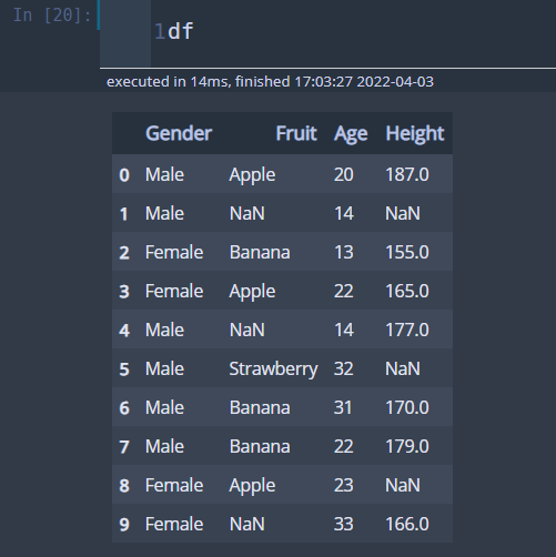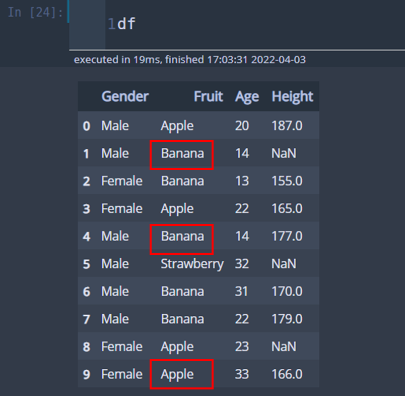 'Fruit' : ['Apple',np.nan,'Banana','Apple',np.nan,'Strawberry','Banana','Banana','Apple', np.nan],