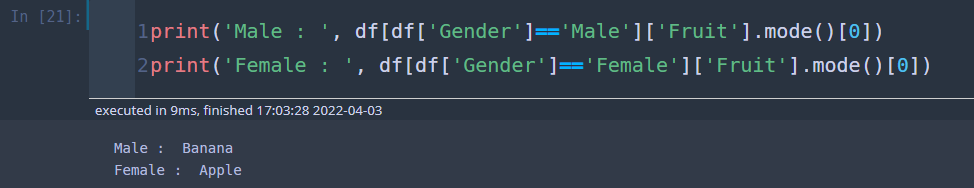 print('Female : ', df[df['Gender']=='Female']['Fruit'].mode()[0])