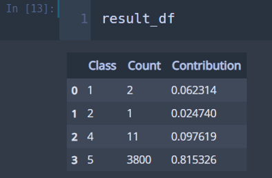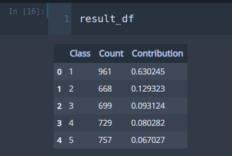 등급의 개수를 정합니다. 꽁냥이는 1~5등급까지 정하기 위해서 개수를 5로 설정했습니다(line 36). 그리고 등급의 기준점을 구합니다(line 37). 등급의 기준점이 무엇인지 확인하기 위해 class_level을 출력해보면 아래와 같이 [1.8, 2.6, 3.4, 4.2]가 보입니다.