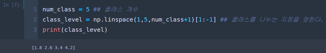 class_level = np.linspace(1,5,num_class+1)[1:-1] ## 클래스를 나누는 지점을 정한다.