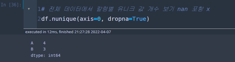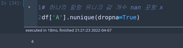 df['A'].nunique(dropna=True) # 하나의 칼럼 유니크 값 개수 nan 포함 x defalut drop=True