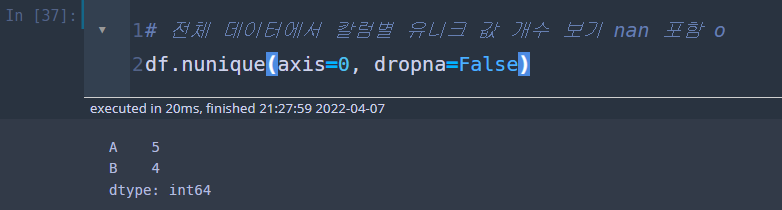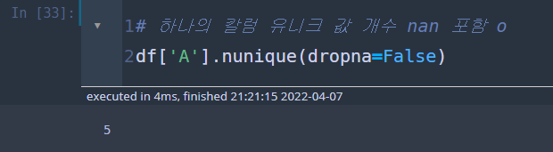df['A'].nunique(dropna=False) # 하나의 칼럼 유니크 값 개수 nan 포함 o