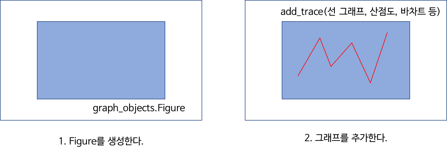 이제 생성된 Figure 위에 그래프 요소를 추가 합니다. 여기서 그래프 요소란 산점도(Scatter Plot), 선 그래프(Line Chart), 막대그래프(Bar Chart)를 말합니다. Plotly에서 그래프 요소는 add_trace를 이용하여 추가한다는 것을 기억하세요.