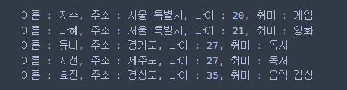 print('이름 : {}, 주소 : {}, 나이 : {}, 취미 : {}'.\