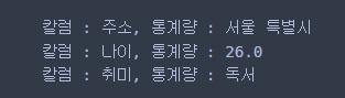 format(idx, row['주소'], row['나이'], row['취미']))