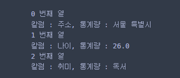 print('칼럼 : {}, 통계량 : {}'.format(col, df.iloc[:, i].mode().values[0]))
