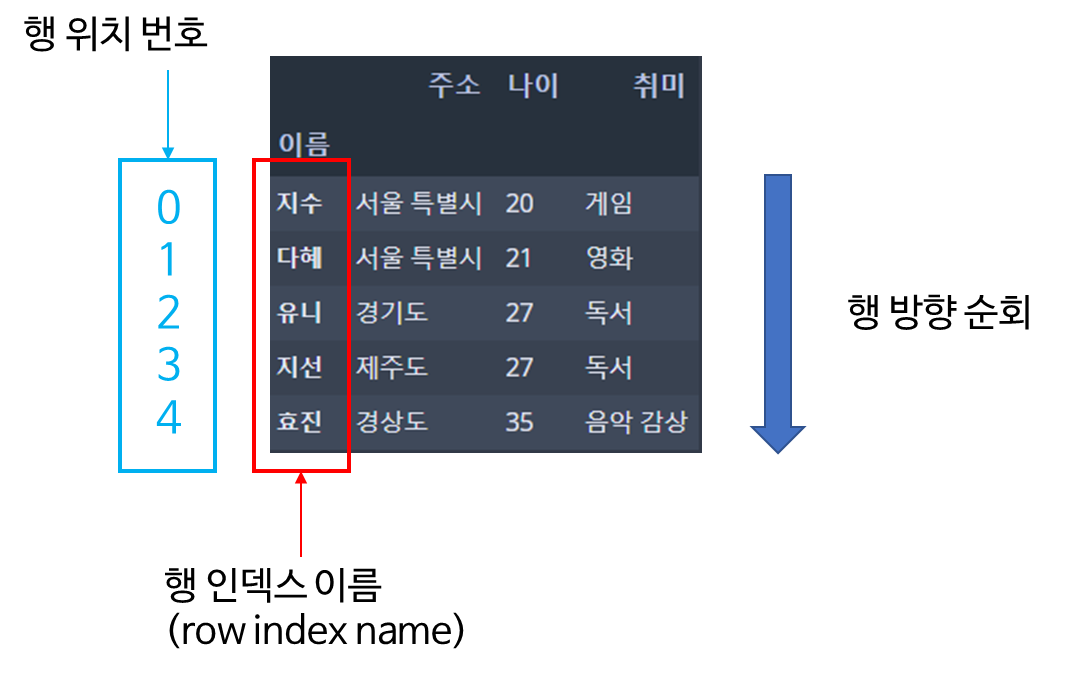 행 방향으로 순회하는 방법은 행 인덱스 이름(Index name)으로 순회하는 방법과 행 위치 번호로 순회하는 방법이 있습니다.