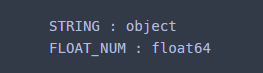 STRING 칼럼은 object(보통 문자형이라고 생각하면 됨), FLOAT_NUM 칼럼은 float64라는 데이터 타입을 갖고 있습니다. 이때 STRING 칼럼은 float으로 FLOAT_NUM 칼럼은 int형으로 바꿔볼게요.