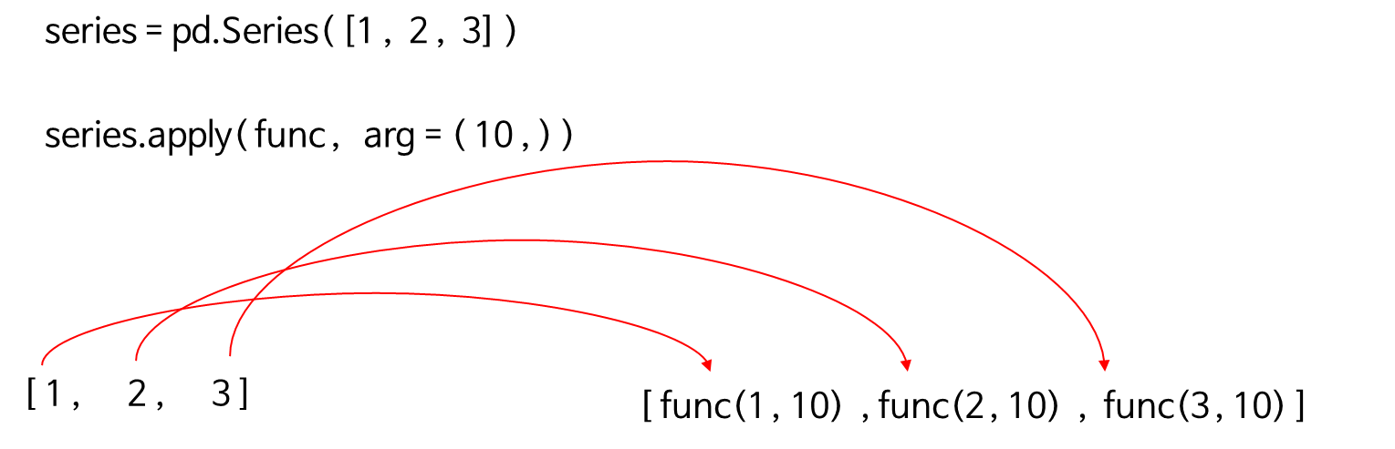 아래 그림은 apply 동작 원리입니다. map과 비슷하지만 apply는 함수의 부가적인 인자도 넣어서 적용시킬 수 있습니다. 부가적인 인자는 튜플을 써서 지정합니다.