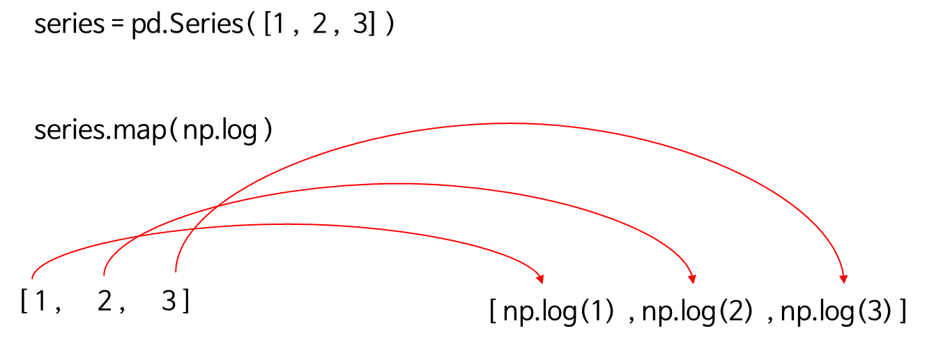 Pandas에서는 map 또는 apply를 이용하여 칼럼에 함수를 적용할 수 있습니다. map 함수는 Pandas Series 객체가 갖고 있는 메서드이며 함수를 인자로 받습니다. map의 동작 원리는 시리즈 객체가 갖고 있는 원소에 접근하여 각 원소에 함수를 적용시킨다는 것입니다. 아래 그림을 보면 이해가 쉽습니다.