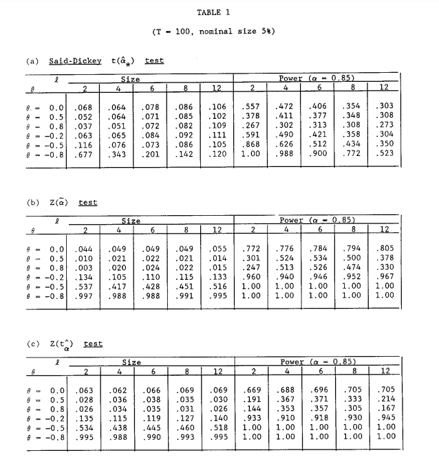 여기서 두 $Z$ 통계량 $Z(\hat{\alpha})$과 $Z(t_{\hat{\alpha}})$을 쓴 이유가 엿보였다(물론 내생각이다. 하지만 논문 어디에서 왜 두개를 고려했는지에 대한 설명이 없었다). Said-Dickey가 제안한 검정 통계량 보다 더 우월하다는 것을 유리하게 비교하기 위하여 $Z$통계량 2개를 제안한 것이 아닌가 싶다. 실제로 시뮬레이션 결과를 이야기할 때 그랬다.