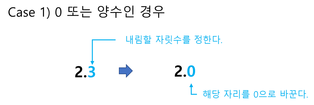 예를 들어 숫자 2.3을 소수점 첫째 자리에서 내림한다고 해보자. 그러면 과정은 아래와 같다.
