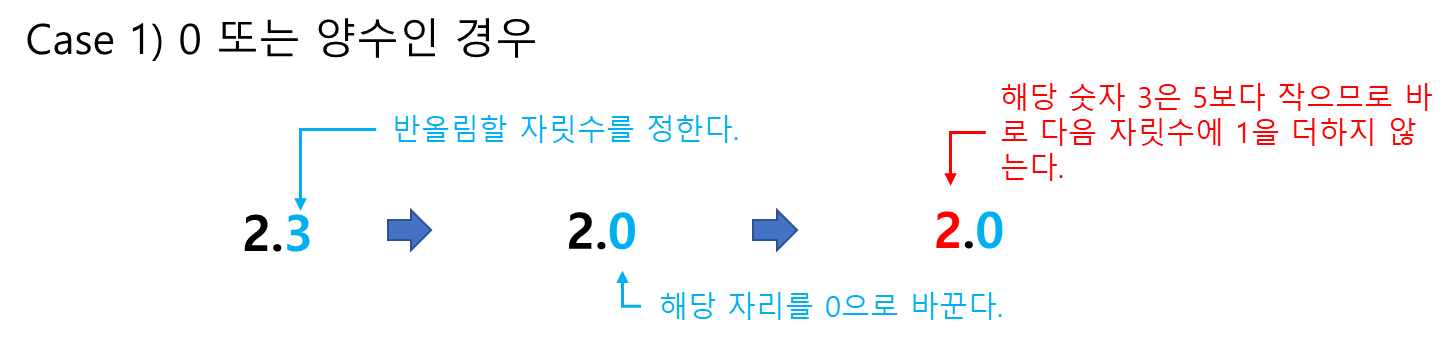 반올림 과정은 여러 가지로 설명할 수 있겠지만 나는 0 또는 양수인 경우와 음수인 경우 2가지로 나누어 정의했다.