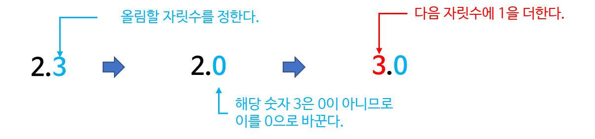 예를 들어 숫자 2.3을 소수점 첫째 자리에서 올림한다고 해보자. 그러면 올림과정은 아래와 같다.