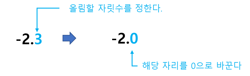 예를 들어 -2.3을 소수 첫째 자리에서 올림 한다면 다음과 같다.