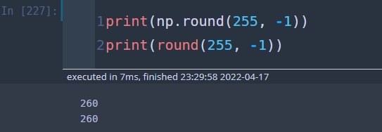 Numpy에서 제공하는 함수나 파이썬 내장 함수인 round가 모두 260을 출력했다. ㄷㄷ; 근데 웃긴 건 255로 하면 260으로 잘 나온다는 것이다.