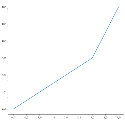 plt.yscale과 plt.semilogy의 차이점은 plt.yscale은 로그 눈금 이외에도 다양한 함수 스케일을 적용할 수 있지만 plt.semilogy은 로그 눈금만을 위한 함수라는 점입니다.