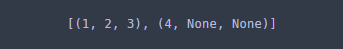 1, 2, 3은 제대로 나왔으나 마지막 원소 4가 없어졌다. 왜냐하면 zip이 튜플을 만드는 과정에서 모든 원소를 다 소모해버렸기 때문에 중간에서 멈춰버린 것이기 때문이다(앞의 설명을 이해했다면 알 수 있다). 만약 4까지 나오게 하고 싶다면 이때 zip 대신에 itertools.zip_longest를 써보자. 가상의 원소(None)가 있는 것처럼 그룹핑을 해준다.