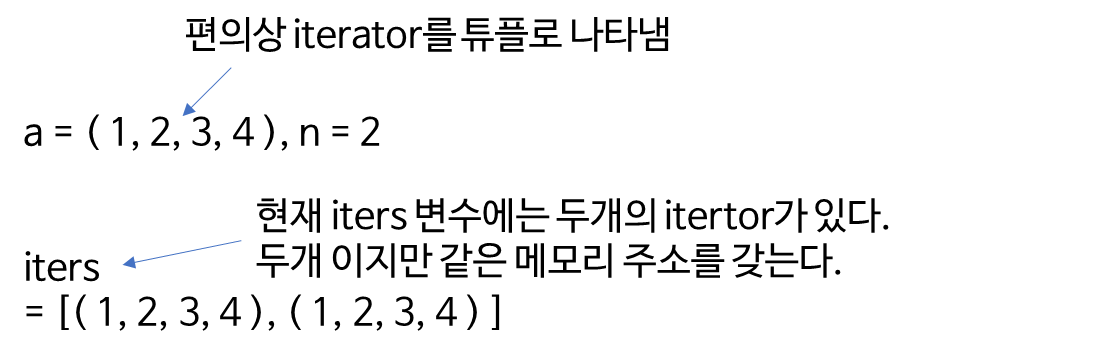 어떻게 이것이 가능한가? 먼저 iters 변수에 동일한 iterator를 한 그룹이 갖는 원소 개수인 n개만큼 생성해준다. 동일한 iterator는 같은 메모리 주소를 가진다.