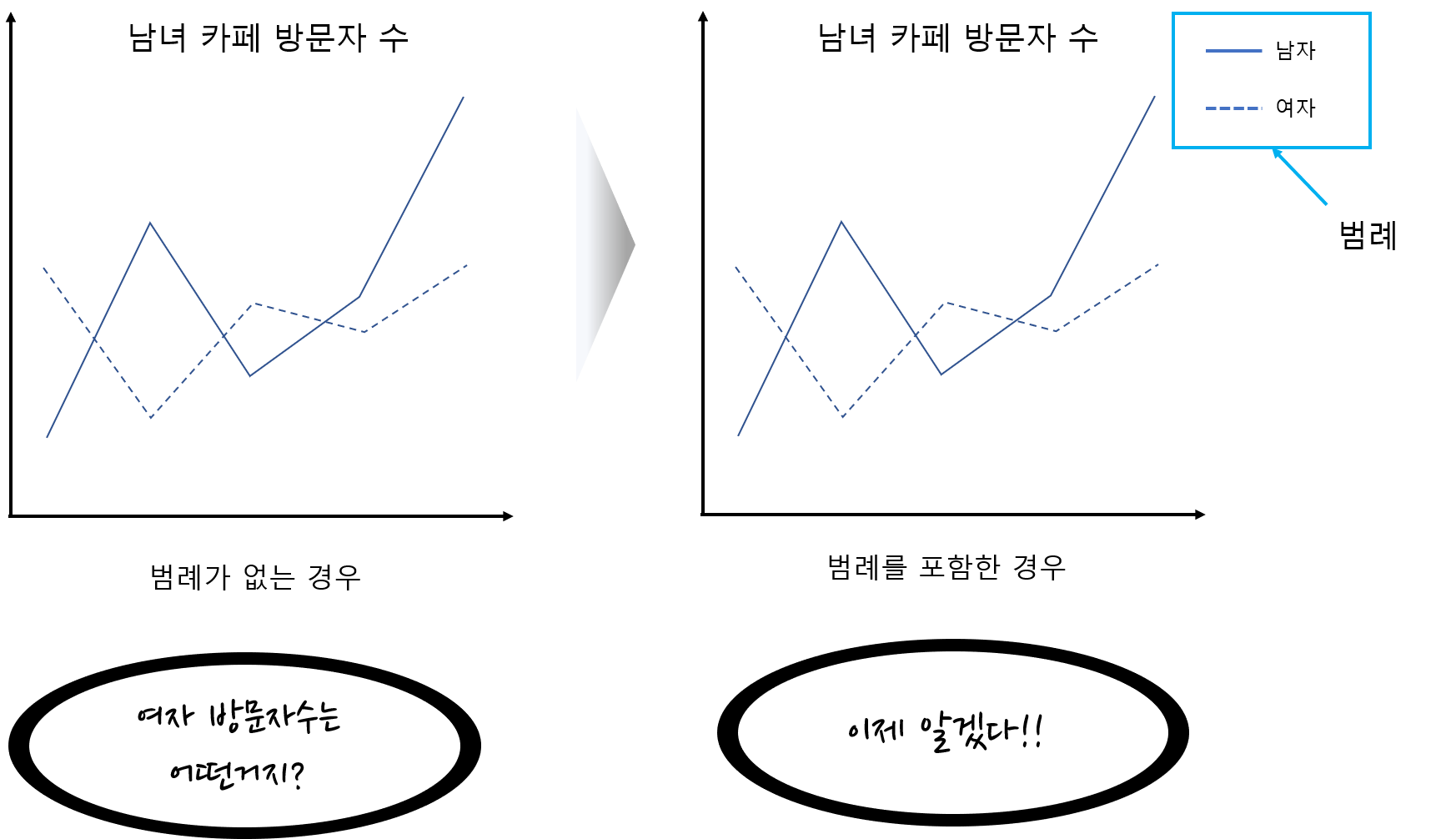 범례는 그래프가 어떤 정보를 담고 있는지 알려주는 친구예요. 아래 그림은 그래프에서 범례가 있어야 하는 이유를 알려주고 있습니다.