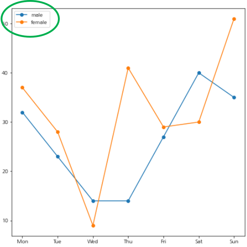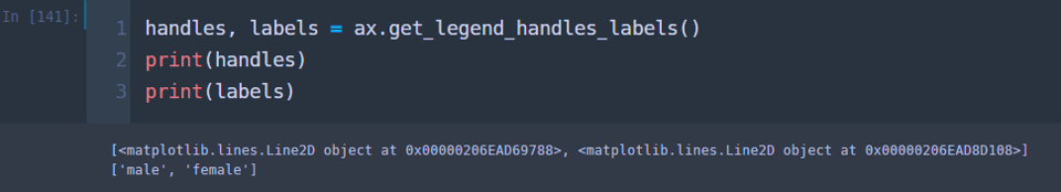 위 그림을 보시면 legend메서드에 따로 인자를 넣지 않아도 알아서 handles에 2개의 선 요소(matplotlib.lines.Line2D 클래스), labels에 2개의 라벨(male, female)을 넣어준 것을 확인할 수 있습니다.
