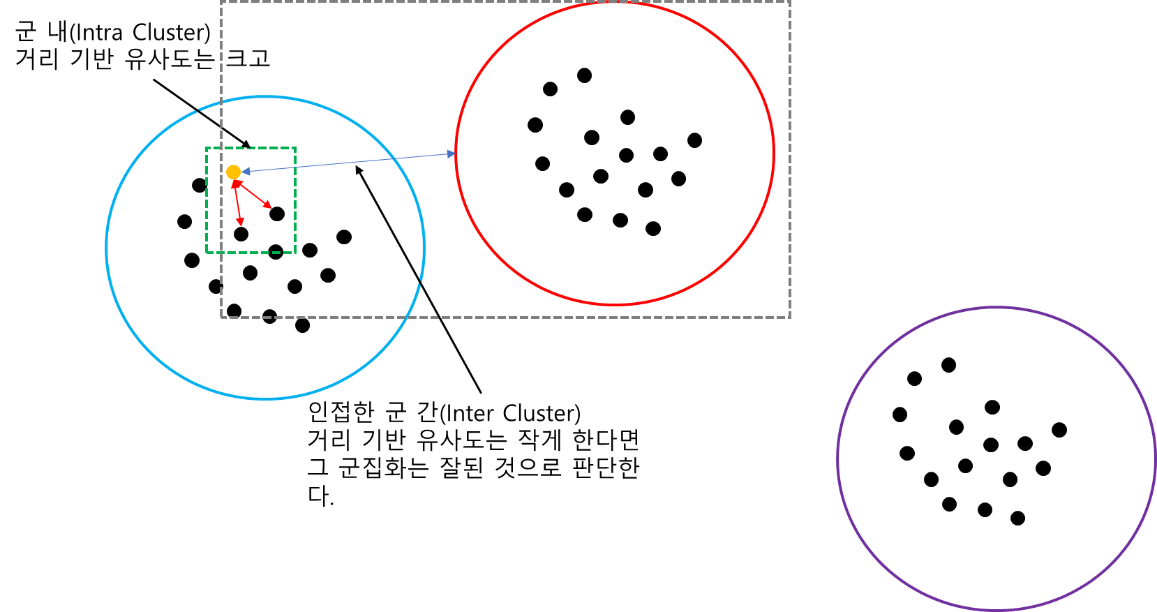 [그림 1]은 Silhouette(실루엣) 지수(계수)의 원리를 나타낸 것이다. 먼저 각 데이터(주황색 점)에 대하여 군 내(Intra Cluster : 파란색 원) 유사도를 계산한다. 그리고 인접한 군 간(Inter Cluster : 빨간 원)의 유사도를 계산하여 비교하게 된다.