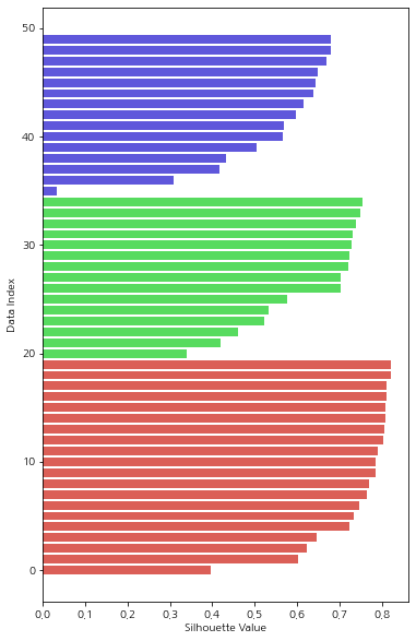 클러스터 별로 색상을 정하고 각 데이터에 대한 Sihouette 값(Value)을 x 축으로 하여 막대그래프 형식으로 나타낼 수 있다(아래 그림 참고). 이를 통하여 개별 데이터들이 1에 가까운 값을 갖는지 눈으로 확인할 수 있고 그에 따라 클러스터링 평가 결과를 시각적으로 이해할 수 있다.