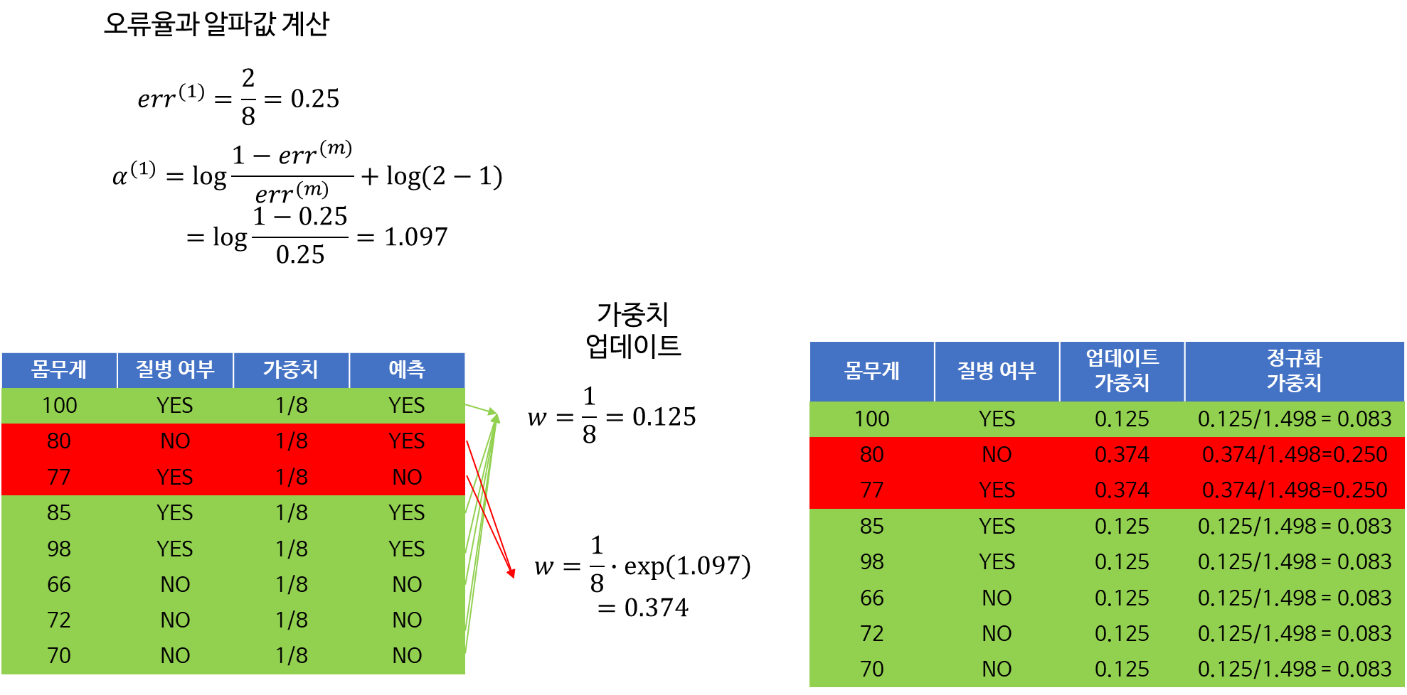 마지막으로 합을 1로 맞춰주기 위하여 업데이트된 가중치에서 가중치 합을 각각 나눠준다. 아래의 경우