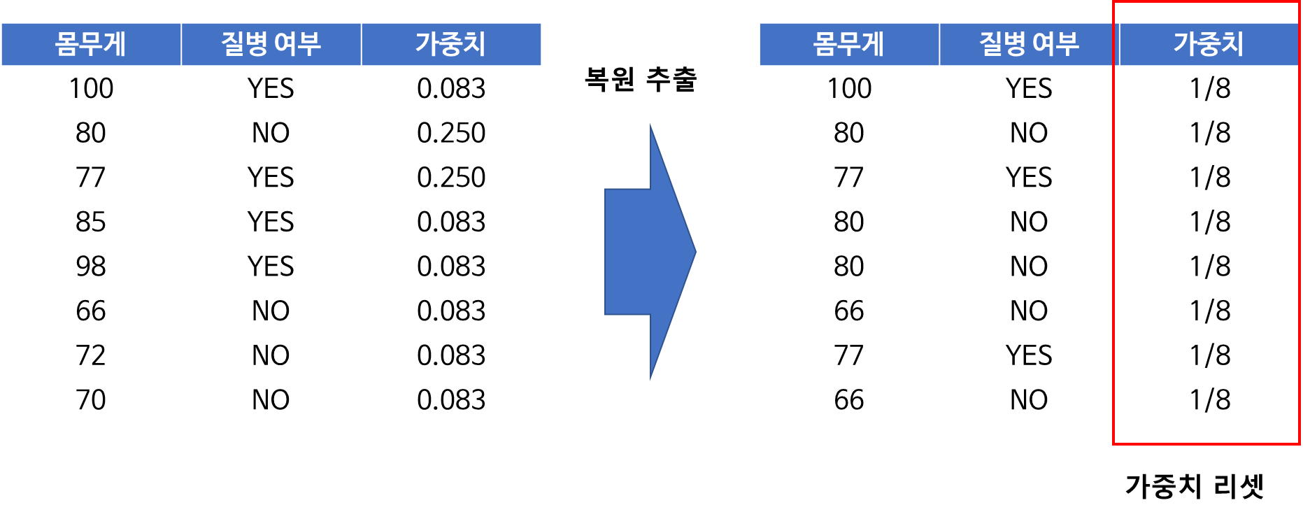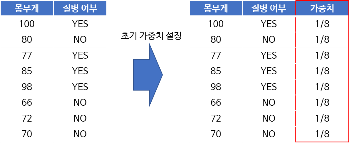 위 알고리즘을 예를 들어서 설명하면 다음과 같다. 아래와 같이 8개의 학습데이터가 있고 몸무게를 이용하여 특정 질병 여부를 예측하는 모형을 AdaBoost 알고리즘으로 만들어본다고 해보자. 그리고 분류기는 깊이가 1인 의사결정나무를 사용한다고 하자.