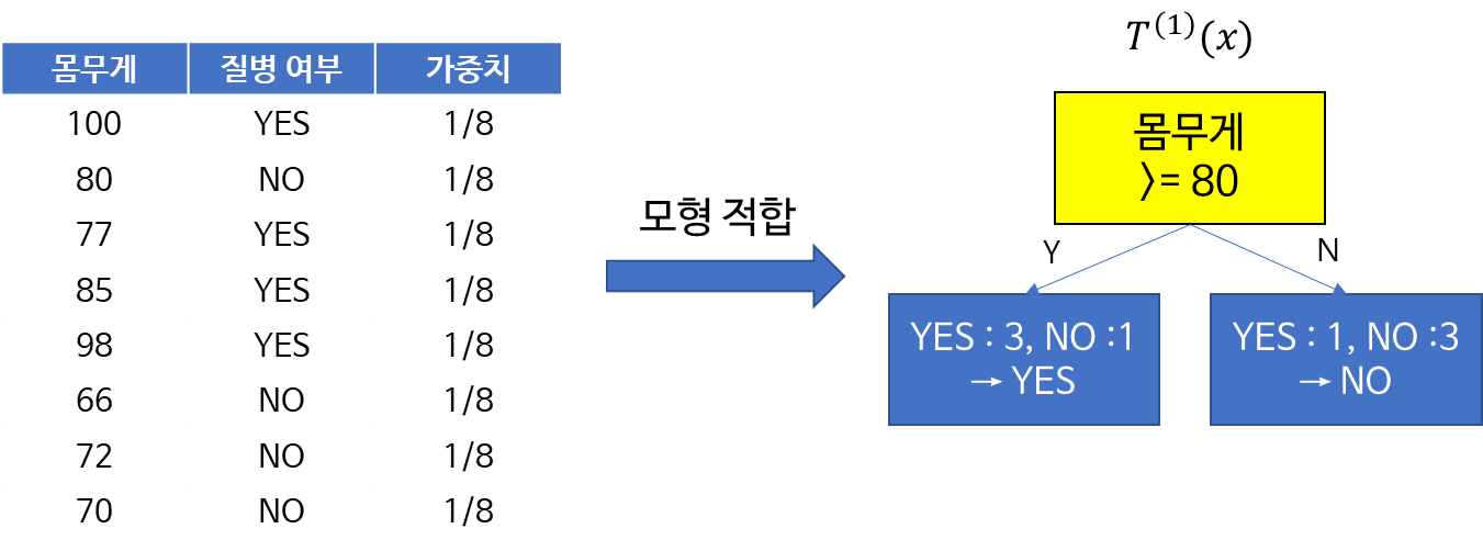 첫 번째 모형 $T^{(1)}(x)$은 처음에 주어진 학습데이터에 대하여 모형을 적합시킨다. 만약 아래 그림의 왼쪽과 같은 의사결정나무를 얻었다면 몸무게가 80보다 작으면 No, 아니라면 Yes로 예측할 것이다.