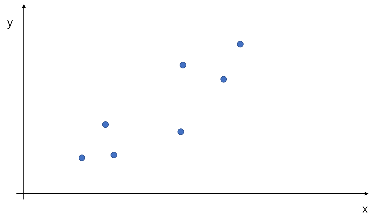 우리는 본능적으로 파란 직선을 고르게 된다. 빨강, 보라 직선은 데이터와의 거리 좀 더 엄밀히 말하면 ($y$축 과 평행한) 데이터와의 수직 거리가 멀기 때문에 적절한 직선이 아니기 때문일 것이다. 결국 우리는 본능적으로 최소제곱법이라는 것을 적용한 것이다.