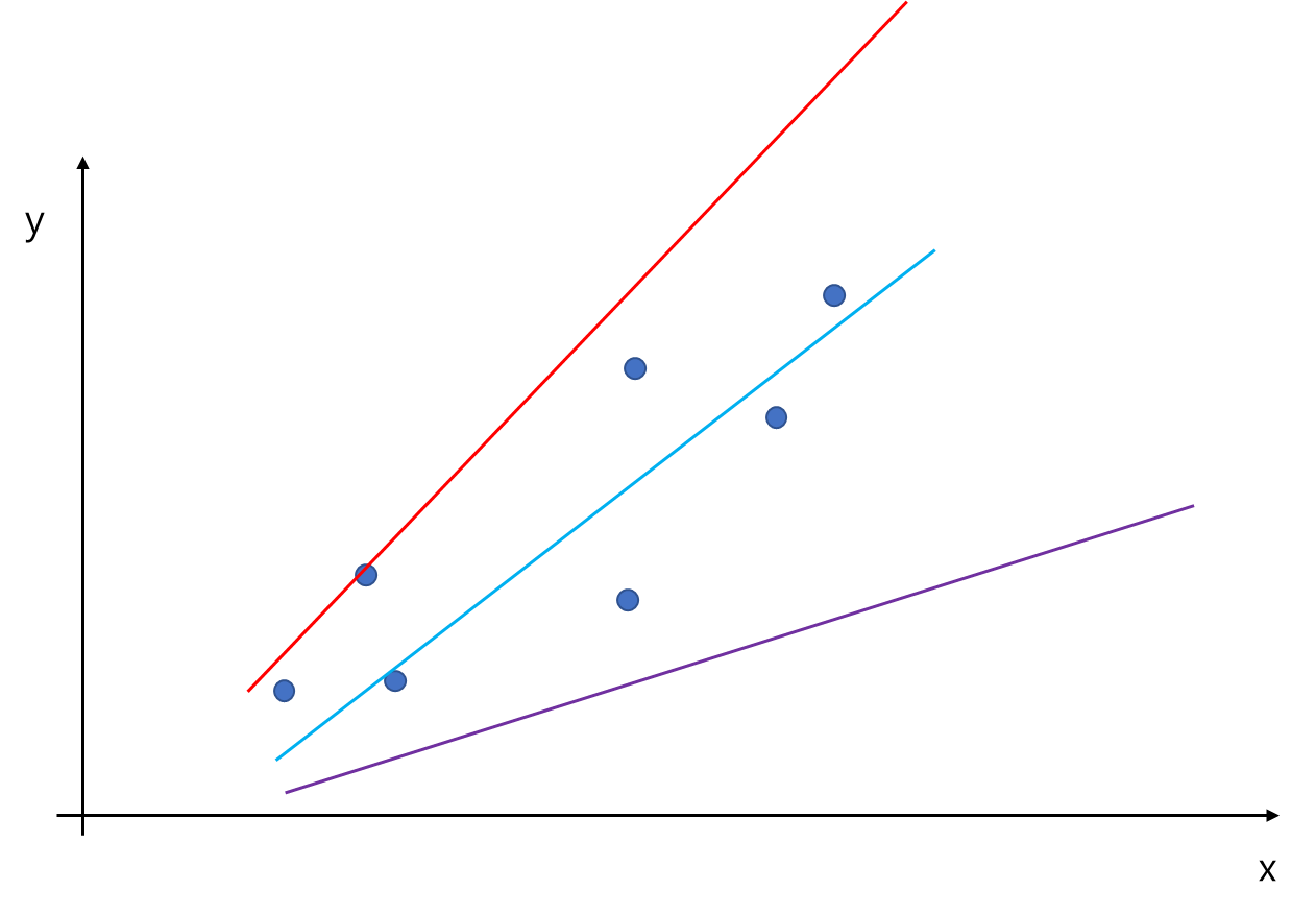 만약 오른쪽 그림의 세 개 직선(빨강, 파랑, 보라 선)에서 데이터 구조를 잘 반영하는 직선을 선택해야 한다면 어떤 것을 선택할까?