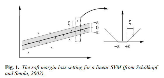 학습데이터 $(x_i, y_i), i=1, \ldots, n$이 있다고 하자. $x_i\in X, y_i \in \mathbb{R}$이다. Vapnik이 1995년에 제안한 $\epsilon$-SV에서의 목표는 모든 학습 데이터에 대하여 잔차가 기껏해야 $\epsilon$인 함수 $f$중에선 최대한 평평한 평면을 찾는다. $f$의 형태는 다음과 같다.