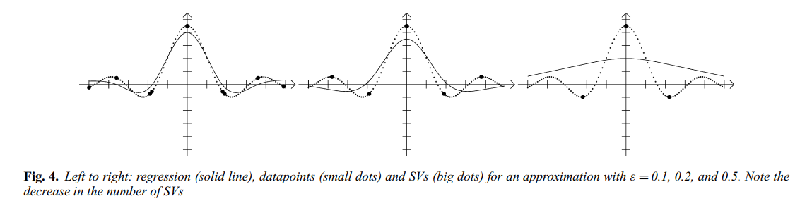 $\epsilon$이 커질수록(정확도가 낮아질수록) 실제 회귀 모형을 만드는데 필요한 SV(서포트 벡터) 개수는 줄어든다. 즉, 회귀 문제를 푸는 데 있어서 모든 데이터가 필요하지 않고 SV만 있으면 정확하게 같은 함수를 만들어낸다. 이는 데이터 압축 효과가 있다는 것이다. 하지만 이는 고차원 데이터나 노이즈가 존재하는 경우에는 그런 효과가 없을 수 있다고 한다.