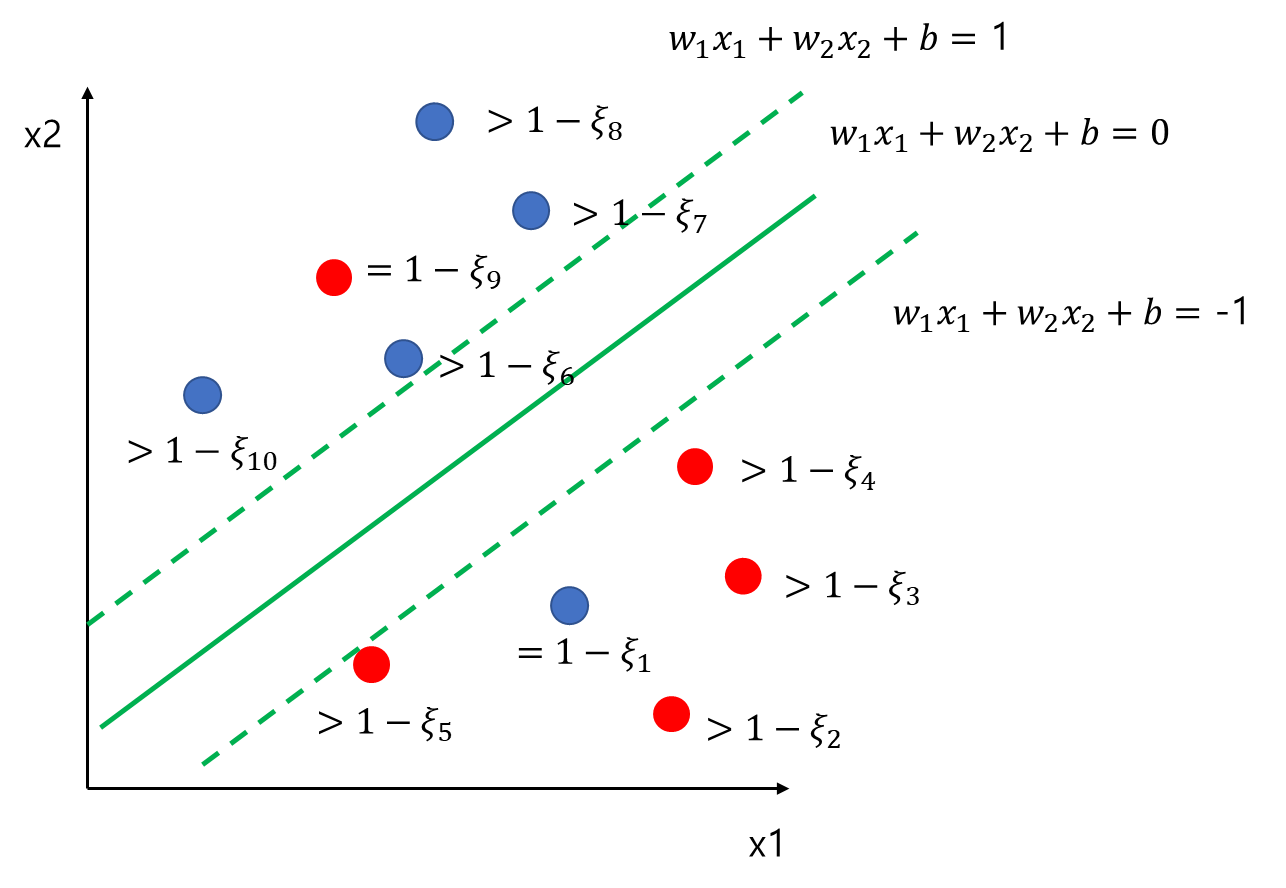 모든 데이터에 대하여 $y_i(w_1x_{i1}+w_2x_{i2}+b)\geq 1-\xi_i$이다.