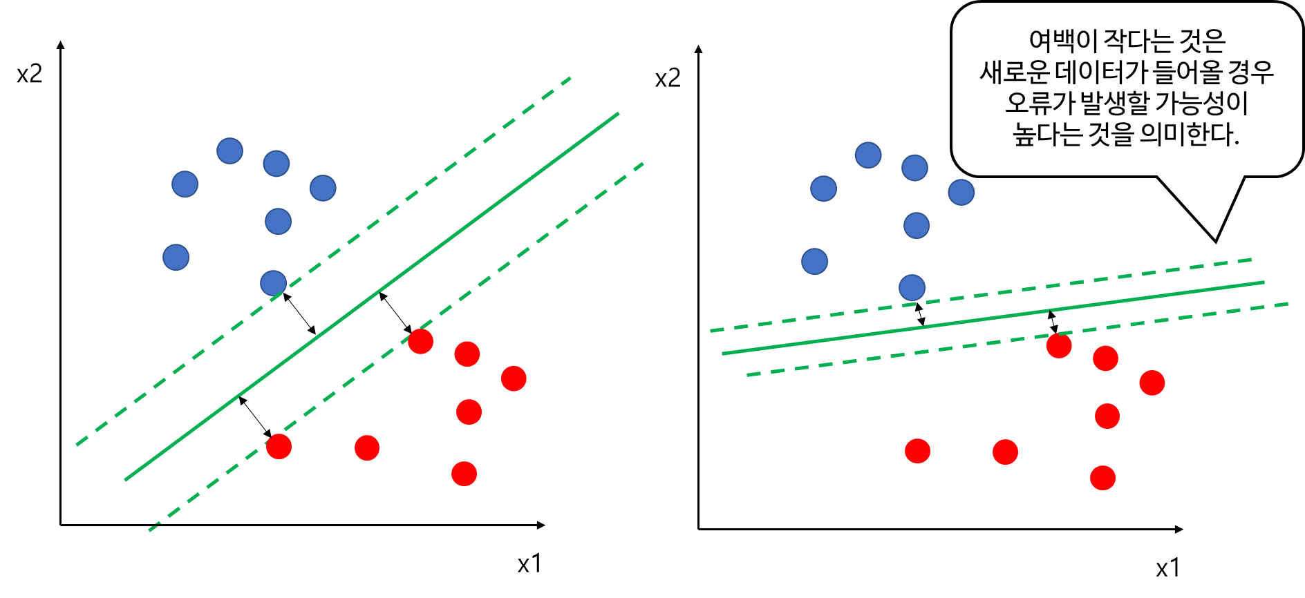 먼저 아래 그림에서 두 클래스를 분류하는 두개의 초록색 실선이 있다고 해보자. 두 개의 직선은 모두 파란색과 빨간색을 완벽하게 분류한다. 하지만 왼쪽 여백(검은선)이 오른쪽보다 더 크다. 앞에서 여백(Margin) 주어진 데이터가 오류를 발생시키지 않고 움직일 수 있는 최대 공간이라고 했다. 그렇다면 여백이 크다는 의미는 (주어진 데이터가 아닌) 새로운 데이터가 들어왔을 때 오류를 발생시키지 않도록 확보된 공간이라는 뜻이다. 이러한 관점에서 여백이 크면 클 수록 새로운 데이터가 오류를 발생시키지 않을 가능성이 크다는 것이다. 다시 말해 여백이 크다는 것이 일반화 관점에서 좋은 것이다.